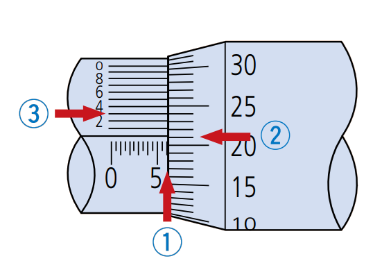 帶游標(biāo)刻度的千分尺在套管基線的上面有游標(biāo)刻度,此時(shí)的讀數(shù)方法如下圖所示: