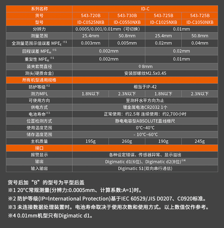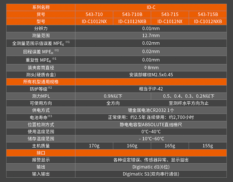 • 543-794/794B的塵/水防護等級達到IP53 (只限分辨力0.001mm型),使用紐扣式電池(SR44)。